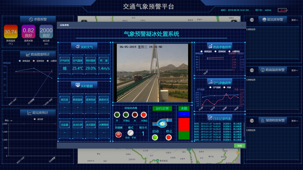 系統根據報(bào)警阈值設置,可(kě)對(d£uì)能(néng)見(jiàn)度低(dī)、路(lù)面濕滑、路(lù)面積水(shuǐ)等災害實現(xiàn)實時(sh∏í)預警。
